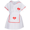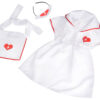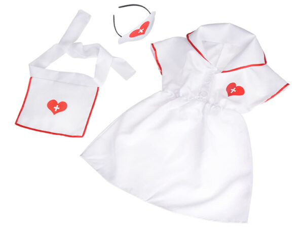 Strój składa się z klasycznej białej sukienki z czerwonymi akcentami, fartuszka oraz stylowego czepka pielęgniarskiego ozdobionego sercem i krzyżykiem. Całość utrzymana jest w stylu medycznym, co dodaje realizmu i sprawia, że dziecko może wczuć się w rolę prawdziwej Pielęgniarki lub Pani doktor.